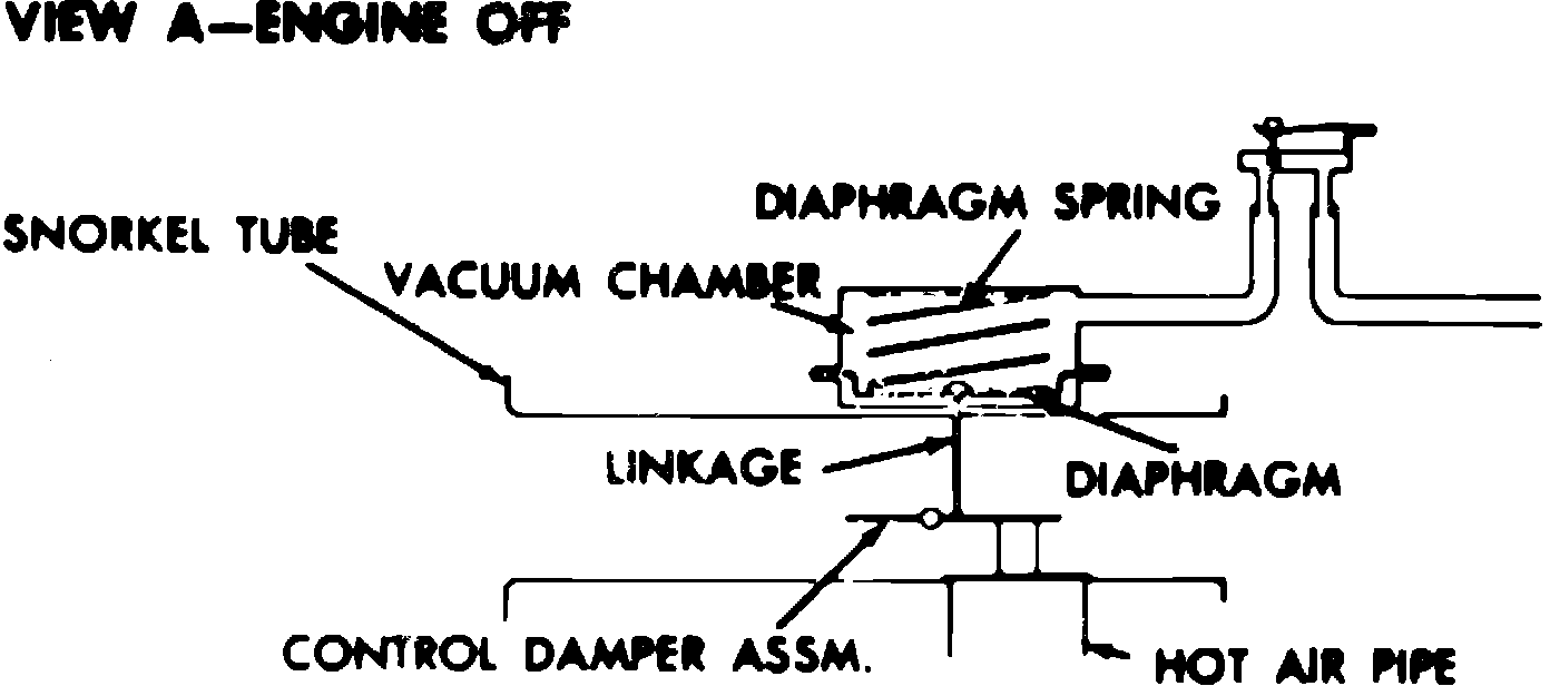 The vacuum motor and control door assembly in the left snorkel on outside air induction units does not have a sensor and is controlled only by manifold vacuum. This snorkel remains closed until full throttle is obtained. With manifold vacuum at 6-8 inches, the door will open, allowing maximum air flow.