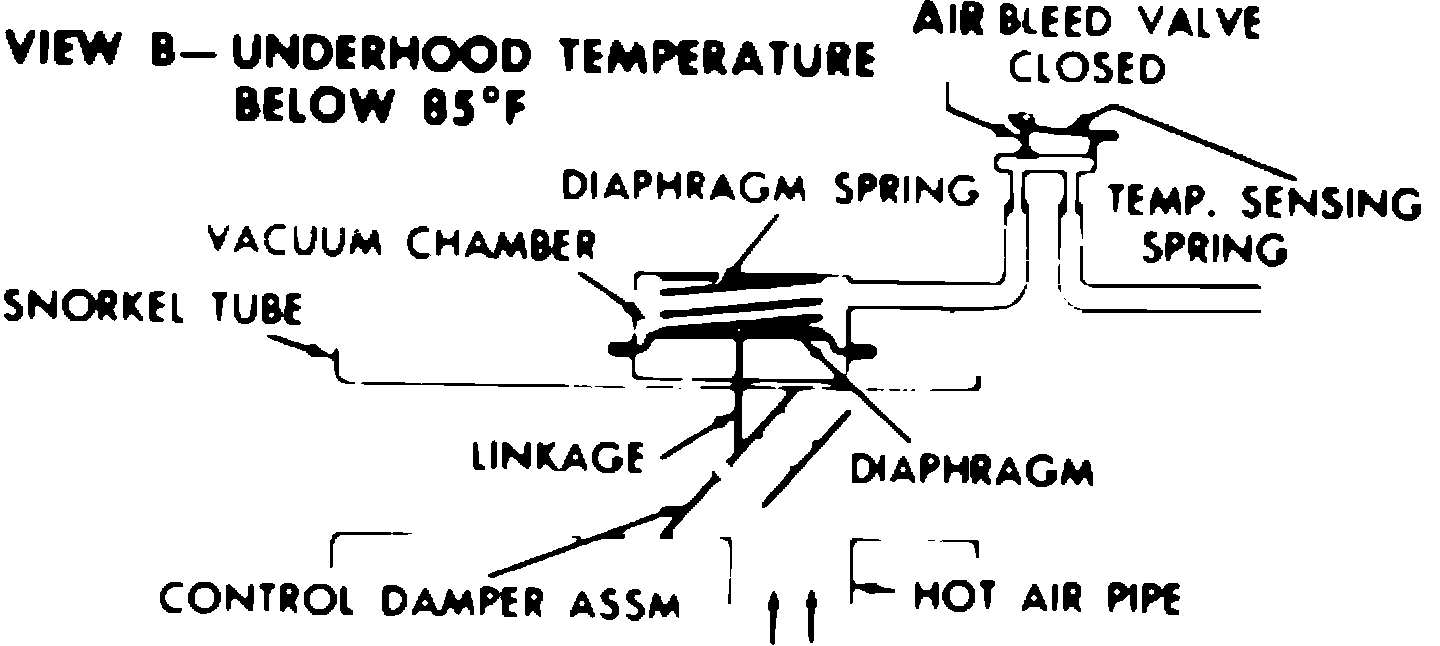 The two air mixing doors work together so that as one opens, the other closes and vice versa. When underhood temperature is below approximately 86° F., the cold air door closes, causing the hot air door to open. Hot air from the exhaust manifold stove is then drawn into the carburetor. As the underhood temperature increases, the cold air door begins to open until the temperature reaches approximately 115° to 130° F, at which time the cold air door is fully open and the hot air door is fully closed.