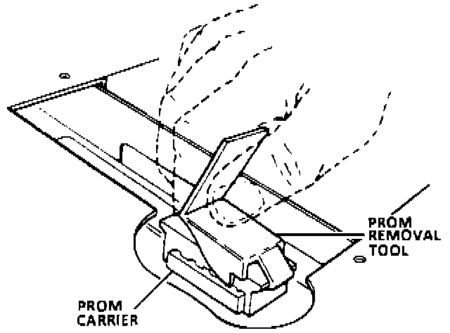 3. Remove PROM using the rocker-type PROM removal tool shown. Engage one end of the PROM carrier with the hook end of the tool. Press on the vertical bar end of the tool and rock the engaged end of the PROM carrier up as far as possible. Engage the opposite end of the PROM carrier in the same manner and rock this end up as far as possible. Repeat this process until the PROM carrier and PROM are free of the PROM socket. The PROM carrier with the PROM in it should lift off of the PROM socket easily.