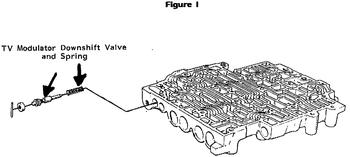 Remove the spring from the T.V. modulator downshift valve (see Figure 1) and install a spring that weighs approximately two pounds more than the original. To weigh springs, compress spring, using the valve, on a scale until stem of valve is just touching the scale, then read the scale (see Figure 2). After installing the stronger spring, L4 and V6 versions will require more acceleration before the transmission will make a 4-3 downshift at approximately 40-50 MPH.