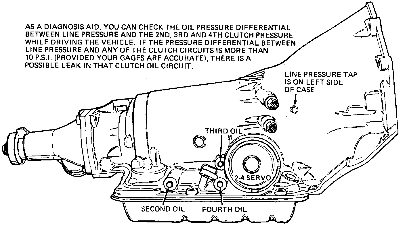 ^ To check minimum T.V. line pressure: set T.V. cable to specification, apply brakes, and take line pressure readings in ranges and at engine RPM's indicated in chart.