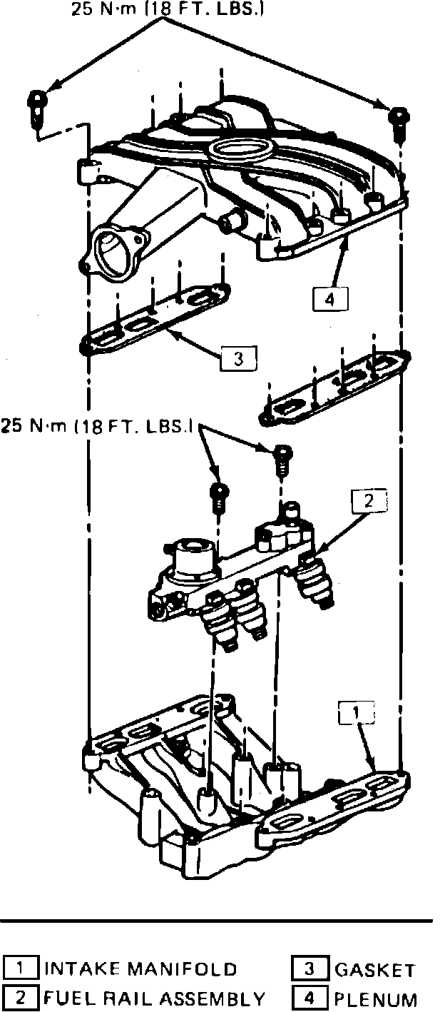 Fig. 5 Manifold plenum & fuel rail installation. 1985---88 V6-173: