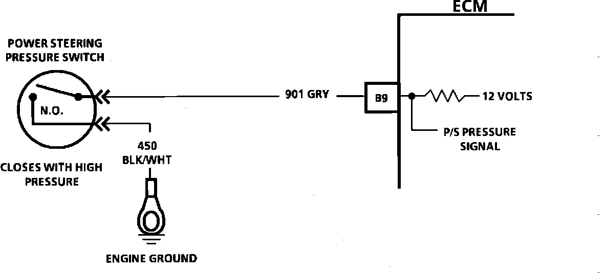 The power steering pressure switch is normally open to ground, and CKT 901 will be near the battery voltage. Turning the steering wheel increases power steering oil pressure and its load on an idling engine. The pressure switch will close before the load can cause an idle problem. Closing the switch causes CKT 901 to read less than 1 volt. The ECM will increase the idle air rate and disengage the A/C relay. A pressure switch that will not close, or an open CKT 901 or 450, may cause the engine to stop when power steering loads are high. A switch that will not open, or a CKT 901 shorted to ground, may affect idle quality and will cause the A/C relay to be de-energized.