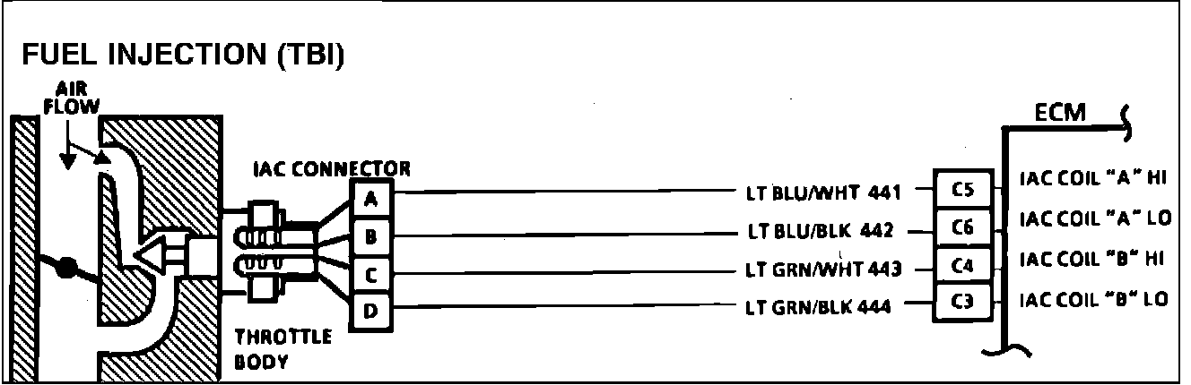 The ECM controls idle rpm with the IAC valve. To increase idle rpm, the ECM moves the IAC valve out, allowing more air to pass by the throttle plate. To decrease rpm, it moves the IAC valve in, reducing air flow by the throttle plate. A "Scan" tool will read the ECM commands to the IAC valve in counts. The higher the counts, the more air allowed (higher idle). The lower the counts, the less air allowed (lower idle).