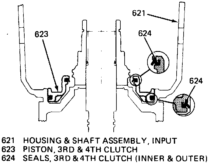 24. Install overrun clutch piston with hub facing upward. If all parts are properly seated at this point, the overrun piston hub will be approximately 3/16 inch below the snap ring groove in the input housing hub.