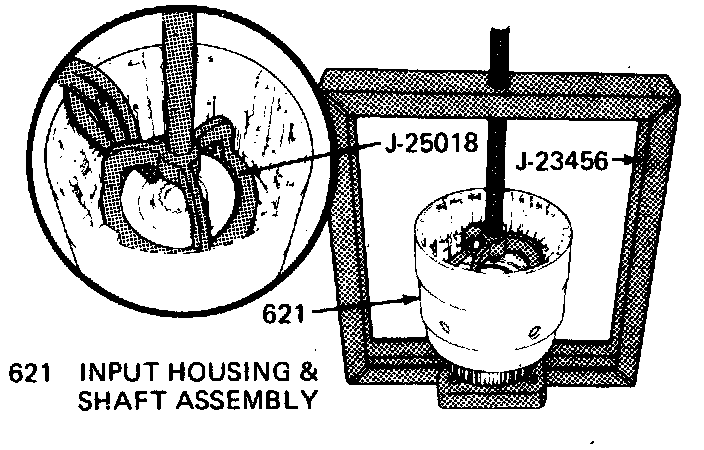 26. Install tool No. J-23456 and J-25018 onto the overrun spring assembly, then compress springs.