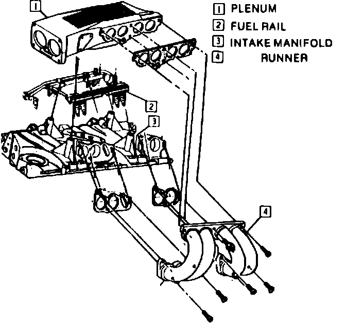Fig. 9 Plenum, runner & fuel line installation. 1985---88 Corvette, 1985---88 V8-305 W/EFI similar: