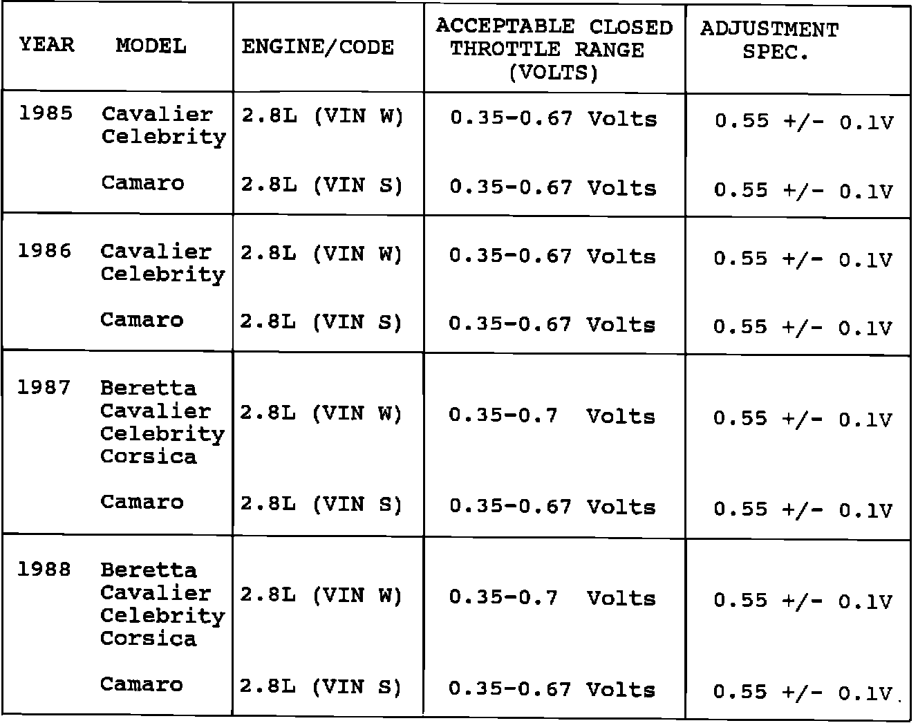 Model and Year: 1985-88 CAVALIER, CAMARO, CELEBRITY, BERETTA, CORSICA WITH 2.8L V6 (VIN CODES W, S)