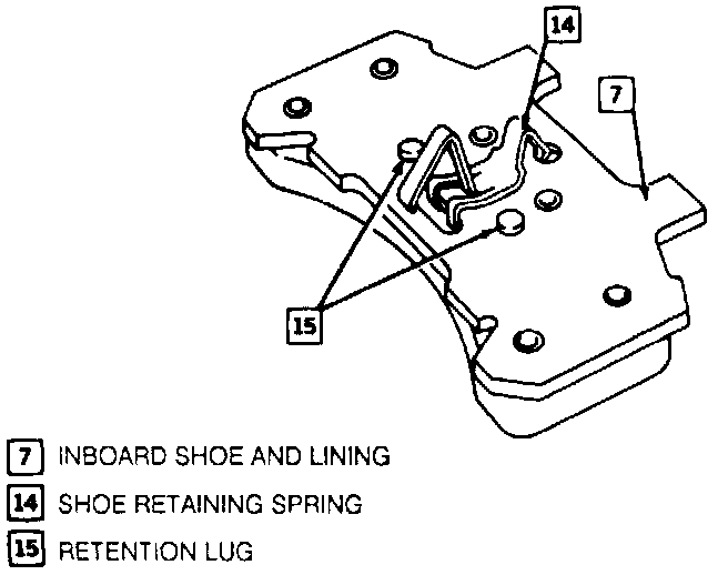 1. Install inboard shoe and lining (7) by snapping shoe retaining sprlng (14) into piston (9) inside diameter. Shoe must lay flat against piston.