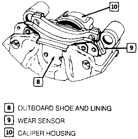2. Install outboard shoe and lining (4) with wear sensor (9) at leading edge of shoe. During forward wheel rotation, the back of the shoe must lay flat against caliper.