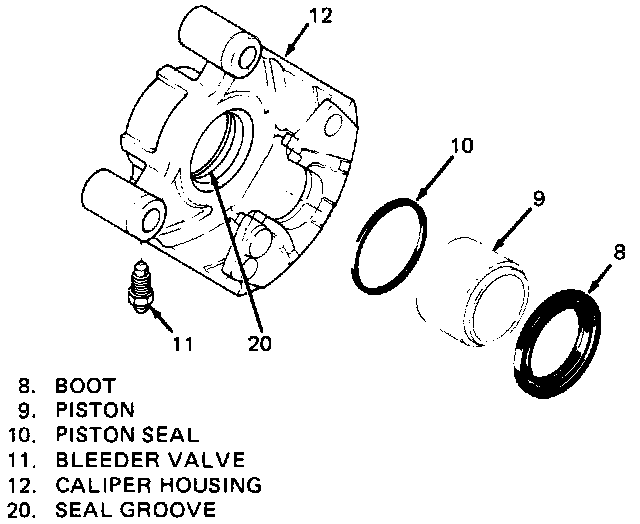 6. Remove piston seal (10) from seal groove in caliper housing (12) bore with a small wood or plastic tool.