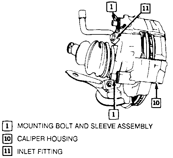 NOTE: If removing caliper assembly only to access other brake parts do not remove brake inlet fitting as indicated in step 7. If the inlet fitting (11) is disconnected, caliper must be bled when reinstalling.