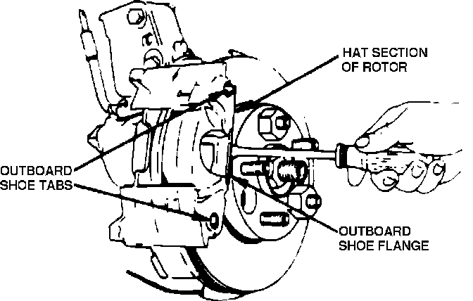 2. Hold outer pad against caliper with suitable clamp or by applying moderate pressure on brake pedal.