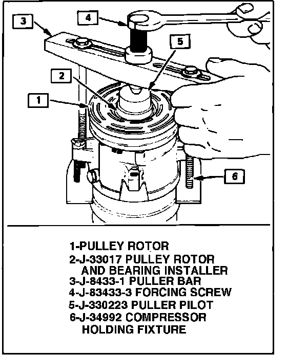 9. Tighten center screw of puller crossbar to press rotor and bearing assembly onto compressor, ensuring that installer remains in direct line contact with inner bearing.