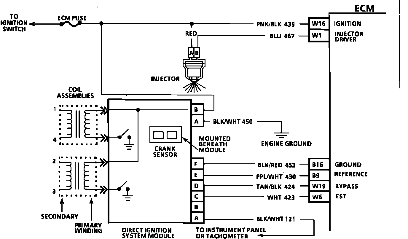 A magnetic crank sensor is used to determine engine crankshaft position, much the same way as the pick-up coil did in HEI type systems. The sensor is mounted in the block, near a slotted wheel on the crankshaft. The rotation of the wheel creates a flux change, in the sensor, which produces a voltage signal. The DIS ignition module processes this signal and creates the reference pulses needed by the ECM to trigger the correct coil at the correct time. If the "Scan" tool did not indicate cranking rpm, and there is no spark present at the plugs, the problem lies in the direct ignition system or the power and ground supplies to the module.