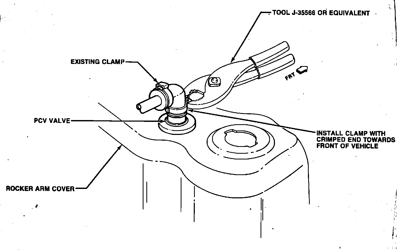 If an engine is diagnosed through normal service procedures as having a loose or disconnected PCV valve rubber elbow, install a clamp P/N 10044319, in the location shown (See Diagram). Crimp the clamp with tool J35566 or equivalent.