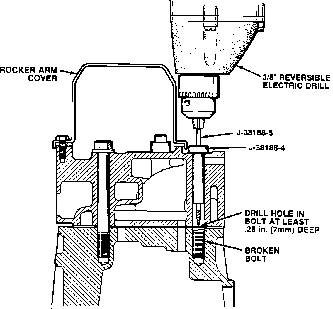 IMPORTANT: TOOL J-38188-3 IS A LEFT-HAND TWIST DRILL - IT IS CRITICAL THAT THE ROTATION OF THE ELECTRIC DRILL BE REVERSED PRIOR TO USING THE DRILL. ROTATION OF THE DRILL SHOULD BE COUNTER-CLOCKWISE.