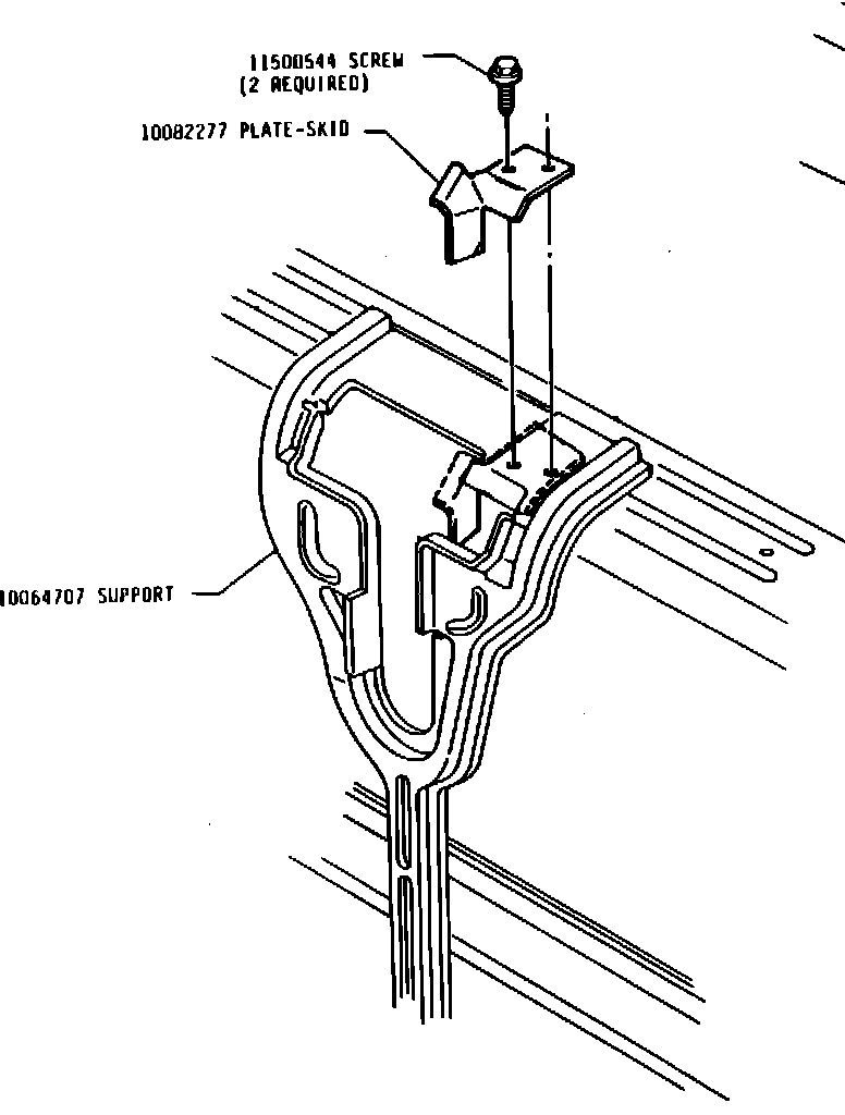 2. Place skid plate (P/N 10082277) on catch surface of support. Nest skid plate fore-aft then slide plate to drivers side of vehicle until nested. It may be necessary to slide skid plate under plastic close out panel to assure proper nesting on the catch surface of support. (See Figure 1).