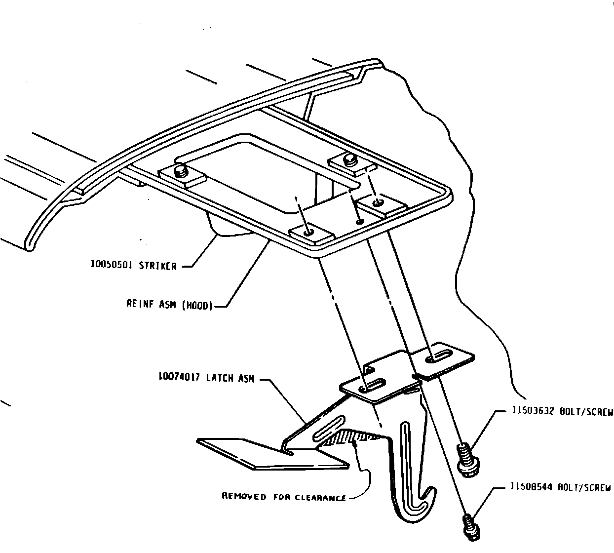 8. Should secondary latch rest on catch surface without sliding down sloped surface of skid plate, loosen screw (P/N 11503632) (2) places (See Figure 2). If not previously removed, remove and discard production locator screw (P/N 11508544) and adjust secondary latch forward slightly. Tighten screw (P/N 11503632) two (2) places. Check operation by slowly lowering hood as before.