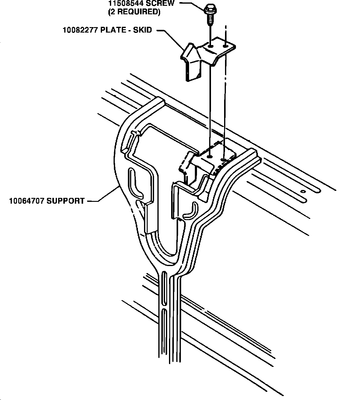 ^ Place skid plate (P/N 10082277) on catch surface of support. Nest skid plate fore-aft then slide plate to drivers side of vehicle until nested. It may be necessary to slide skid plate under plastic close out panel to assure proper nesting on the catch surface of support. (See Figure 1).