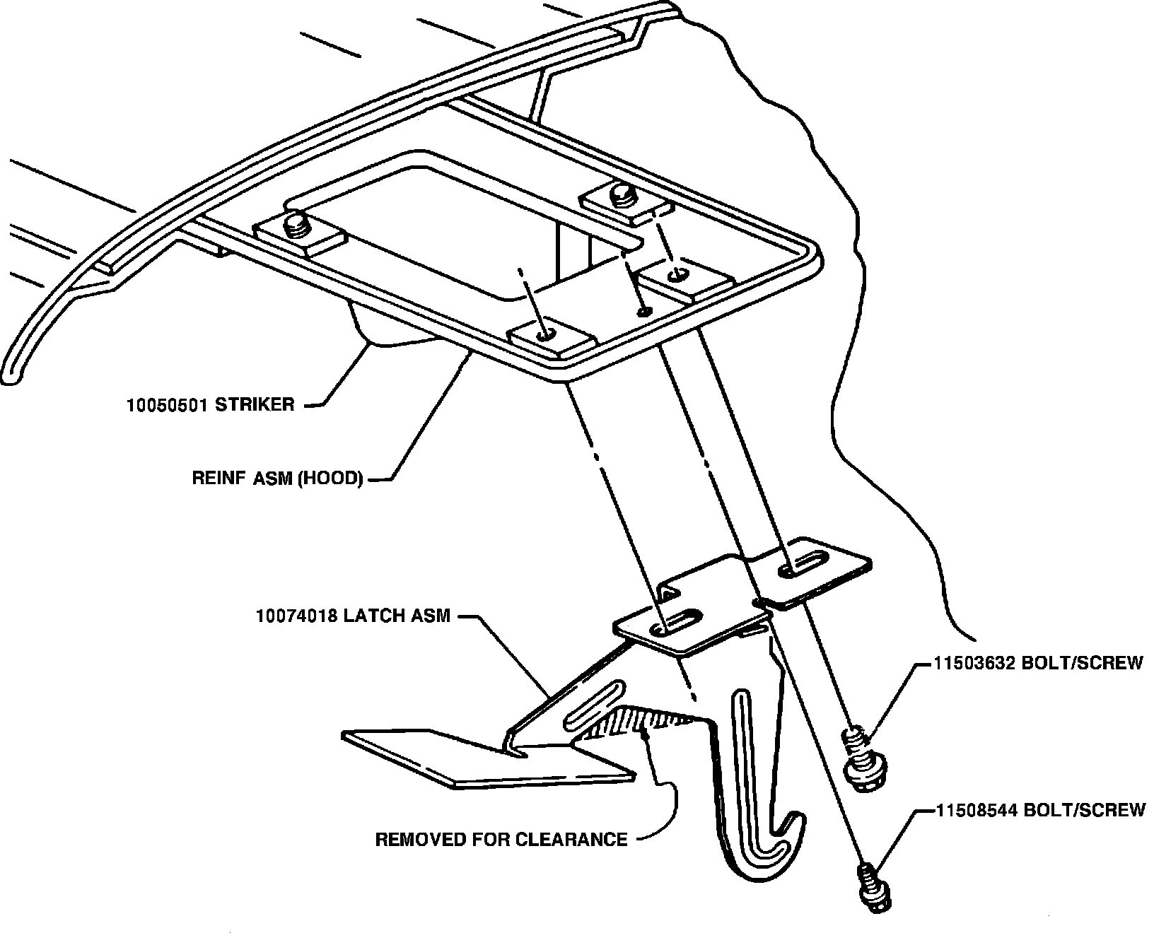 ^ Should secondary latch rest on catch surface without sliding down sloped surface of skid plate, loosen screw (P/N 11503632)