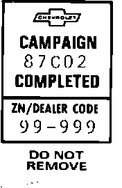 Each vehicle corrected in accordance with the instructions outlined in this Product Campaign Bulletin will require a "Campaign Identification Label". Each label provides a space to include the five digit dealer code of the dealer performing the campaign service. This information may be inserted with a typewriter or ballpoint pen.