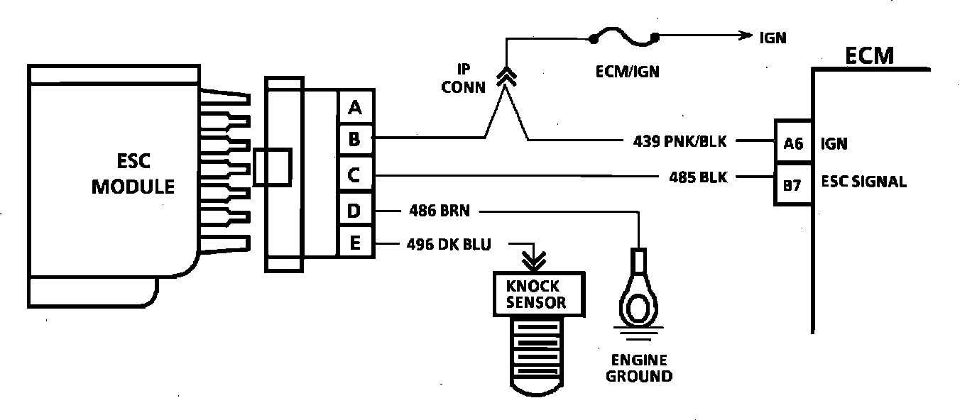 5. Contacting CKT 496, with a test light to 12 volts, should generate a knock signal to determine whether the knock sensor is faulty, or the ESC module can't recognize a knock signal,