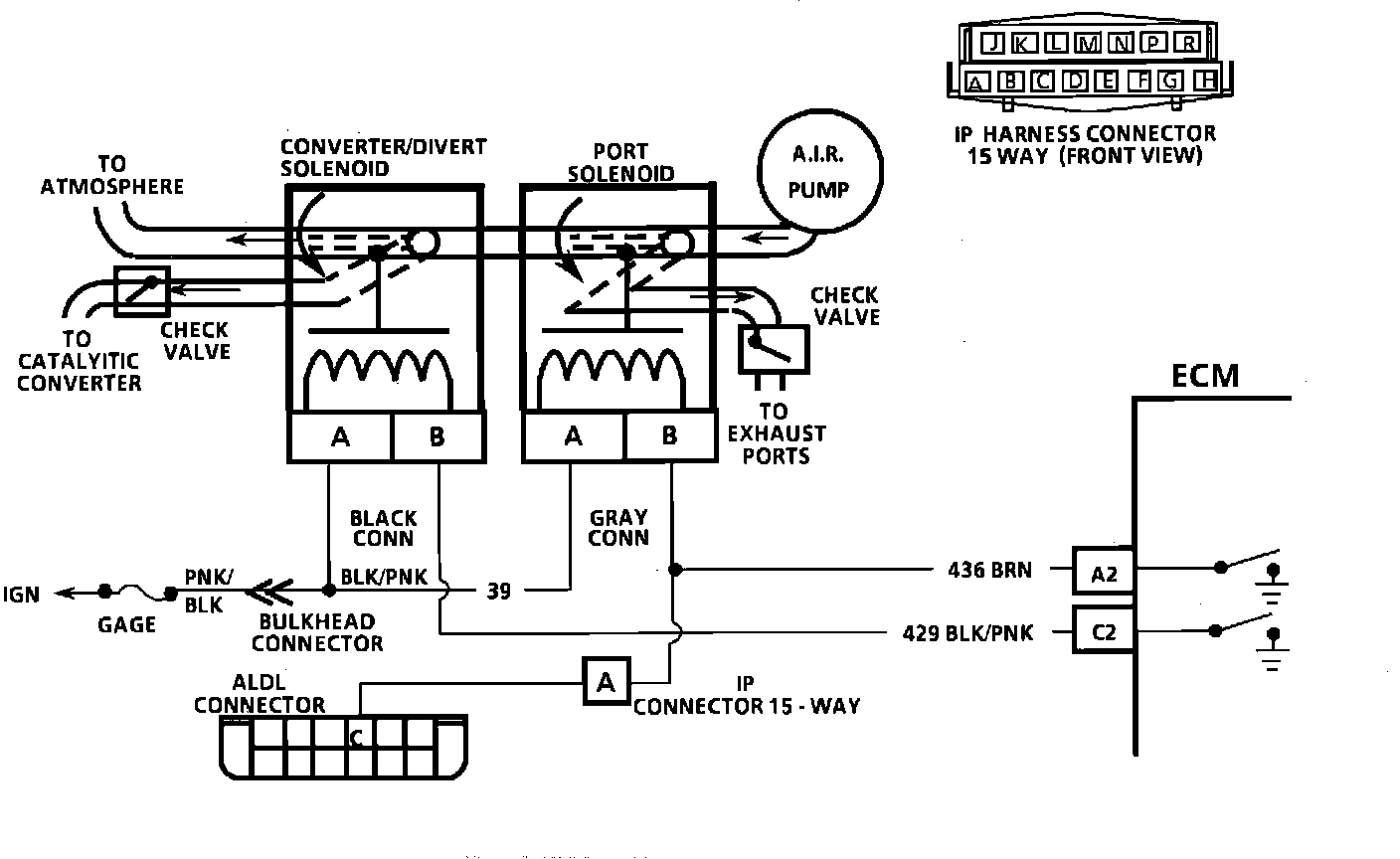 Air management is controlled by a pressure operated port valve and a converter valve, each with an ECM controlled solenoid. When the solenoid is grounded by the ECM, AIR pressure will activate the valve and allow pump air to be directed as follows: