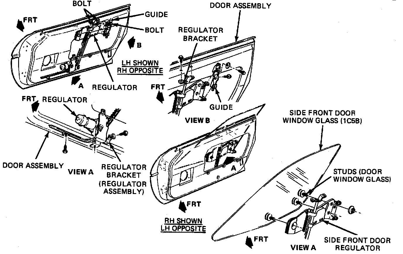 6. Adjust glass as necessary at glass guide stops, anti-rattle cushions, regulator bolts top of door and saddle to glass.