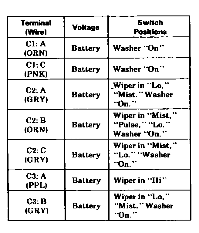 1. To test the wiper/washer motor module, follow this procedure: With connectors C1, C2, and C3 still attached to the wiper/washer motor module, measure the voltage to ground at each terminal below, with the ignition switch in the "Accy." The voltage should be zero in all other switch positions not listed.