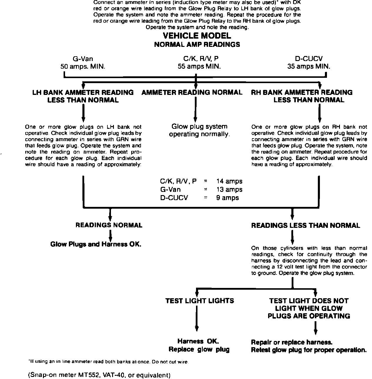 The following procedure provides a fast way to determine whether the glow plug system is functioning correctly or if you have another condition to contend with. It is suggested that this procedure be performed whenever there is doubt about correct system operation. Then refer to the diagnosis charts that follow to pinpoint the condition.