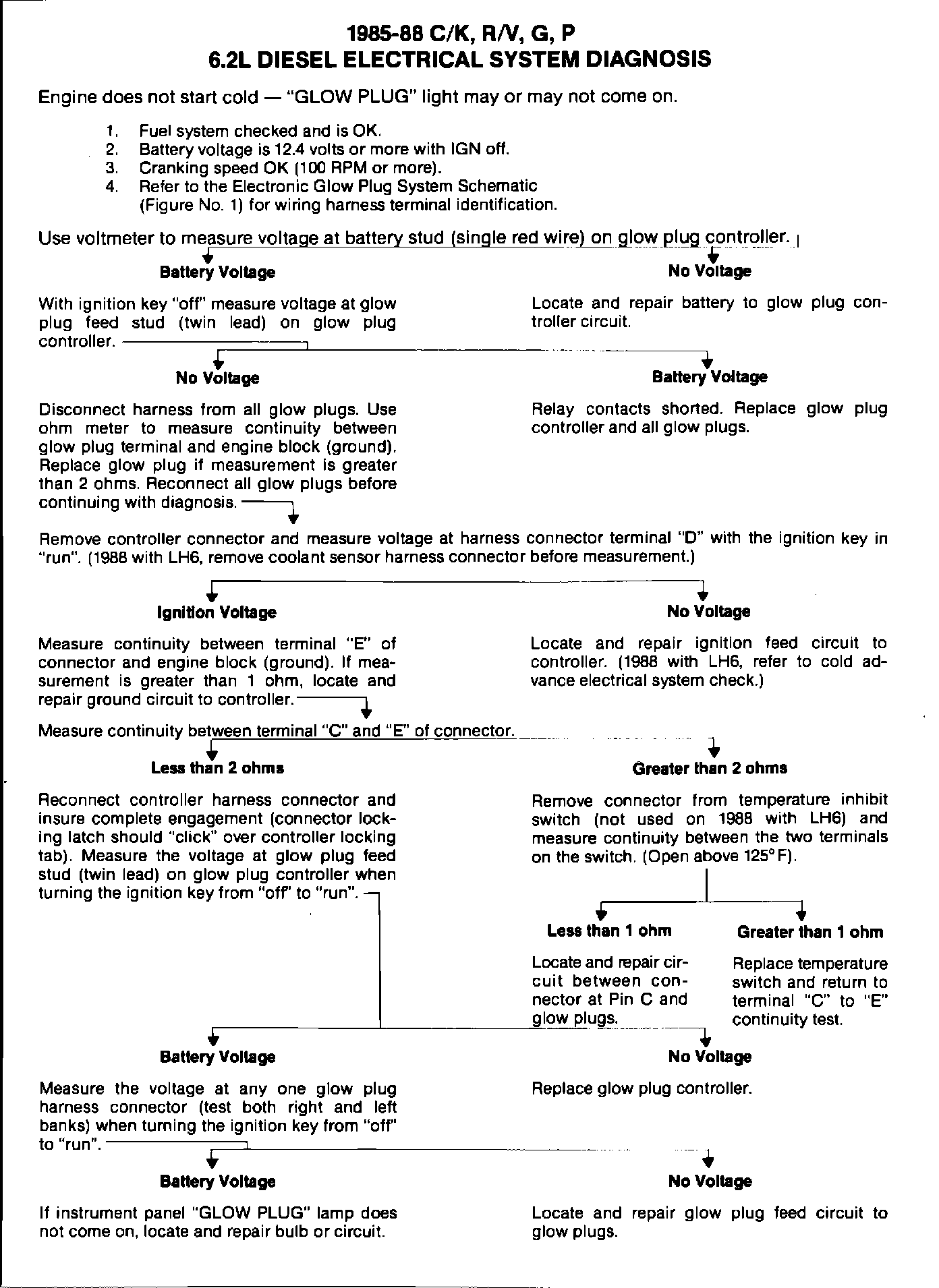 The 1985-88 6.2L diesel engine glow plug system consists of an integral-electronic controller glow plug relay assembly, 6-volt glow plugs, a glow plug light, and a glow plug inhibit temperature switch.