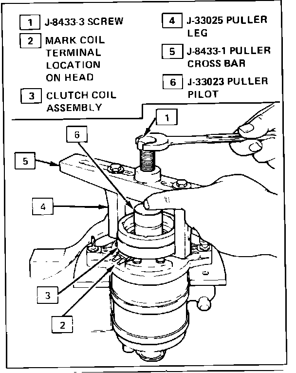 4. Tighten forcing screw J-8433-3 against puller pilot and remove clutch coil.