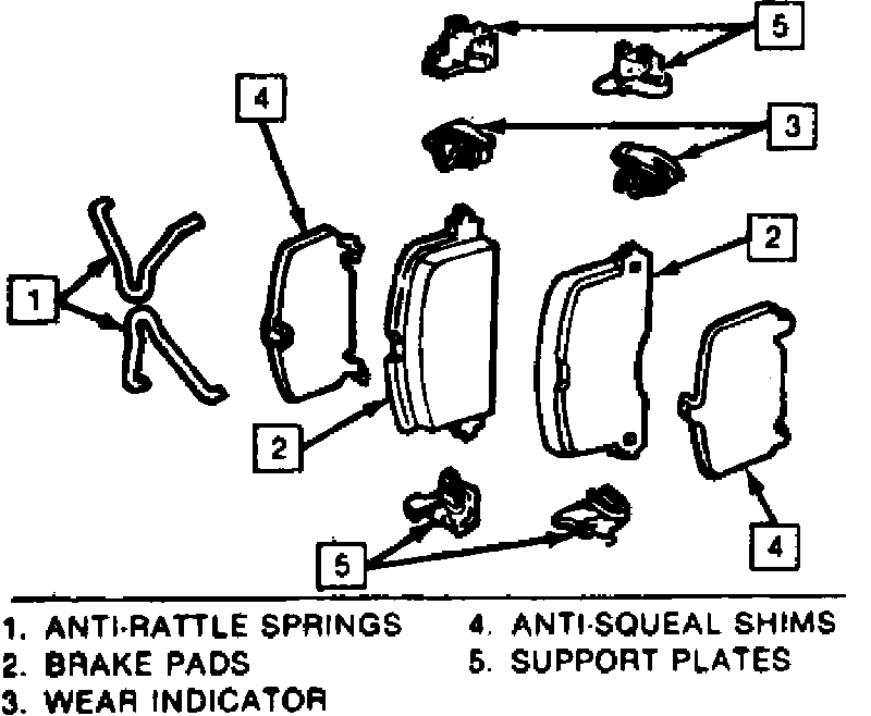 3. Remove pad wear indicator plates and anti-squeal shims.