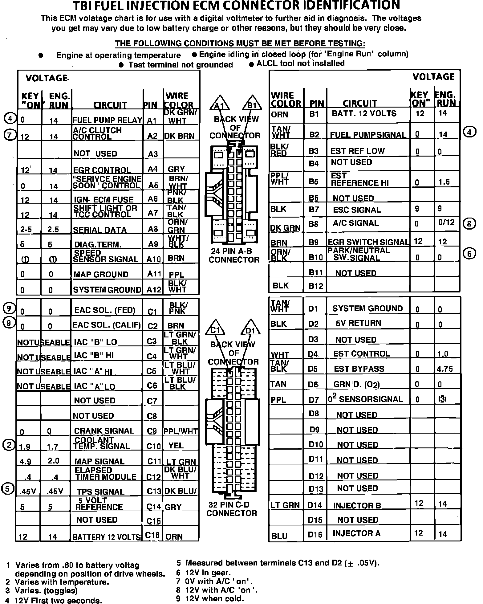 ECM Connector Terminal Identification & Voltage Specifications.: