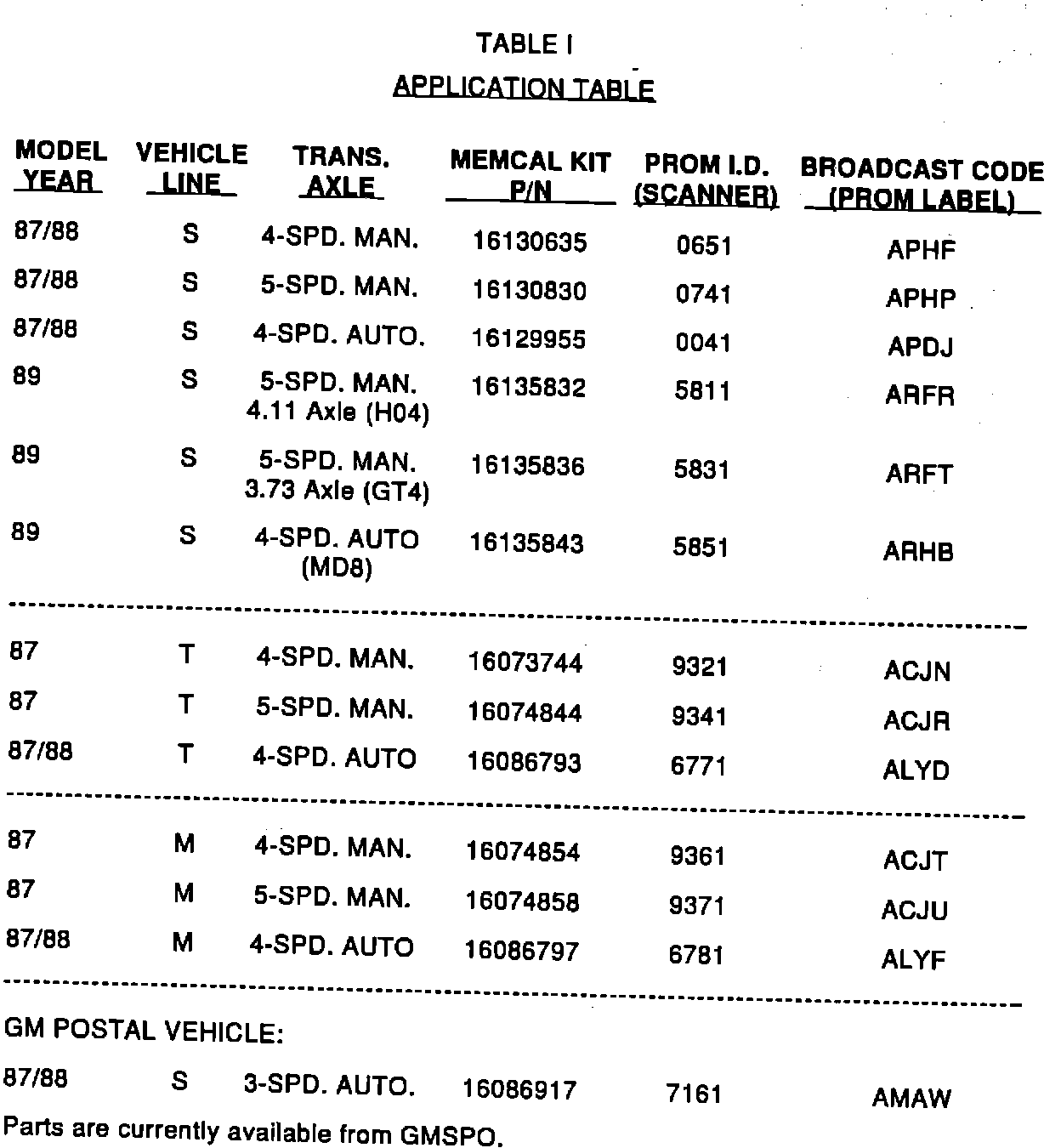 Model and Year: 1987-88 T, M TRUCK AND GM POSTAL VEHICLES WITH 2.5L ENGINE 1987-89 S TRUCK WITH 2.5L ENGINE