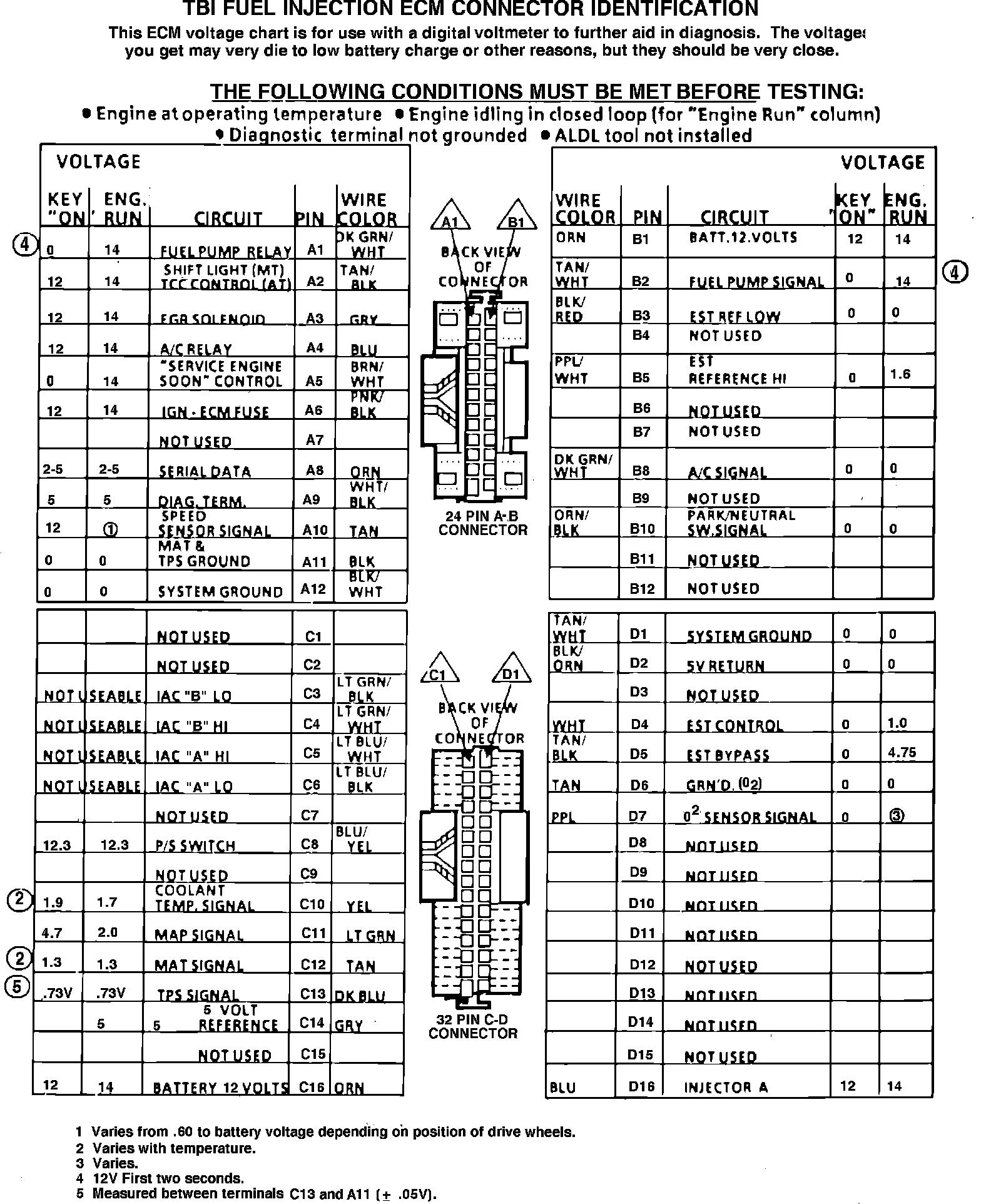 ECM Connector Terminal Identification & Voltage Specifications.: