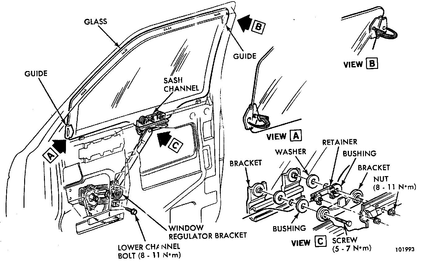 ^ Lower the window until the sash channel and the window can be plainly seen in the door panel opening.