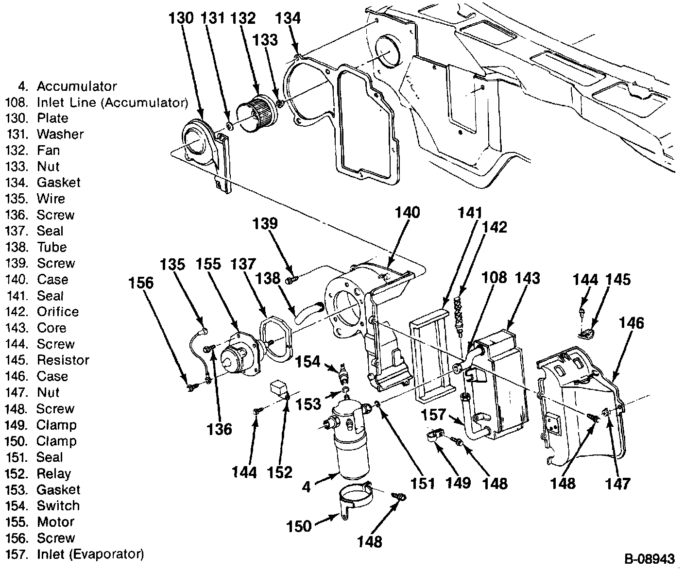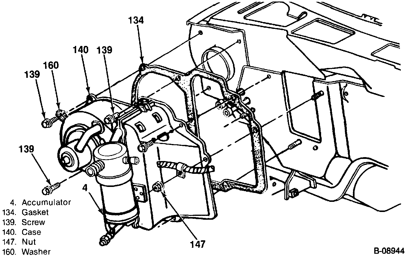 3. Accumulator (4) and bracket (150) to core (143) with screw (148).