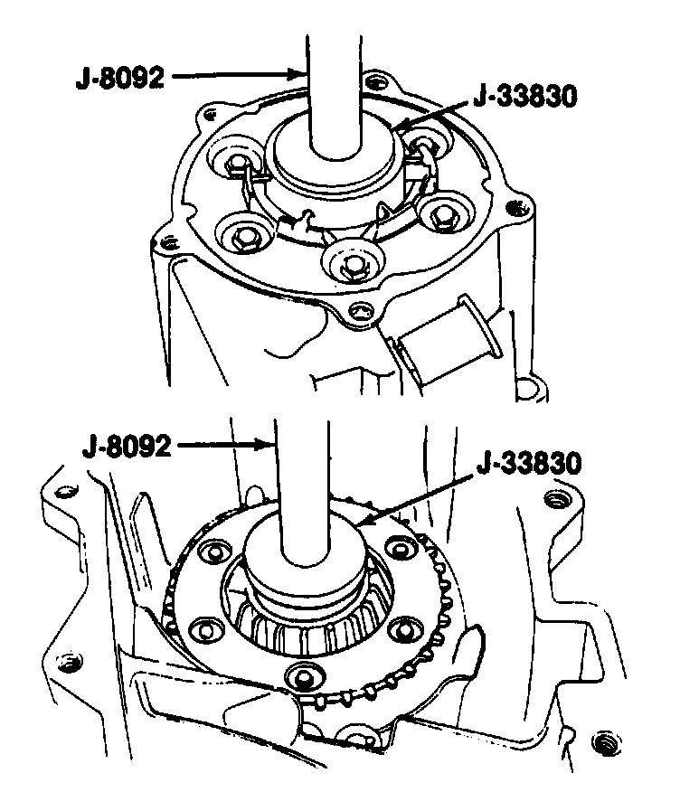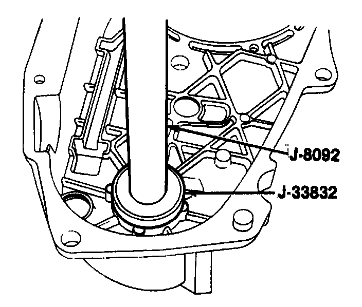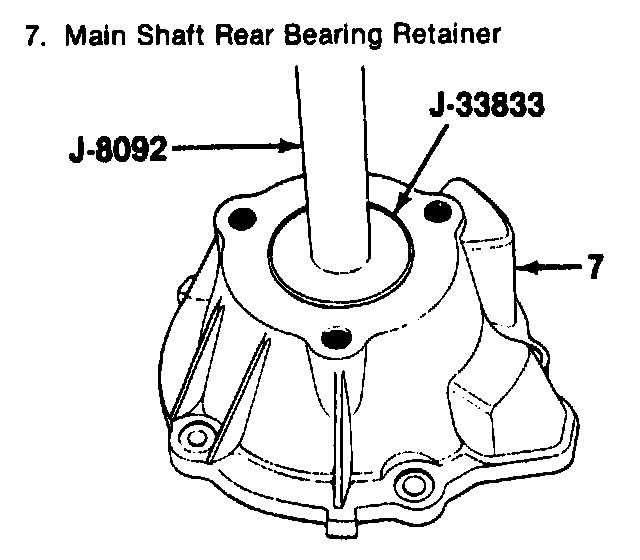 31. Output bearing (10) into the rear retainer (7), using J-33833 and J-8092. Press the bearing until it is seated in the bore.