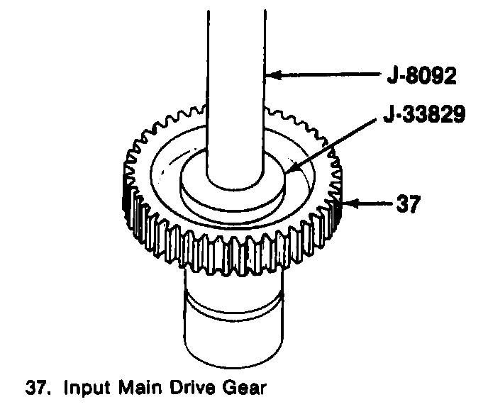 17. Pilot bearing (35) into the input gear (37), using J-33829 and J-8092. Press the bearing until the tool bottoms out.