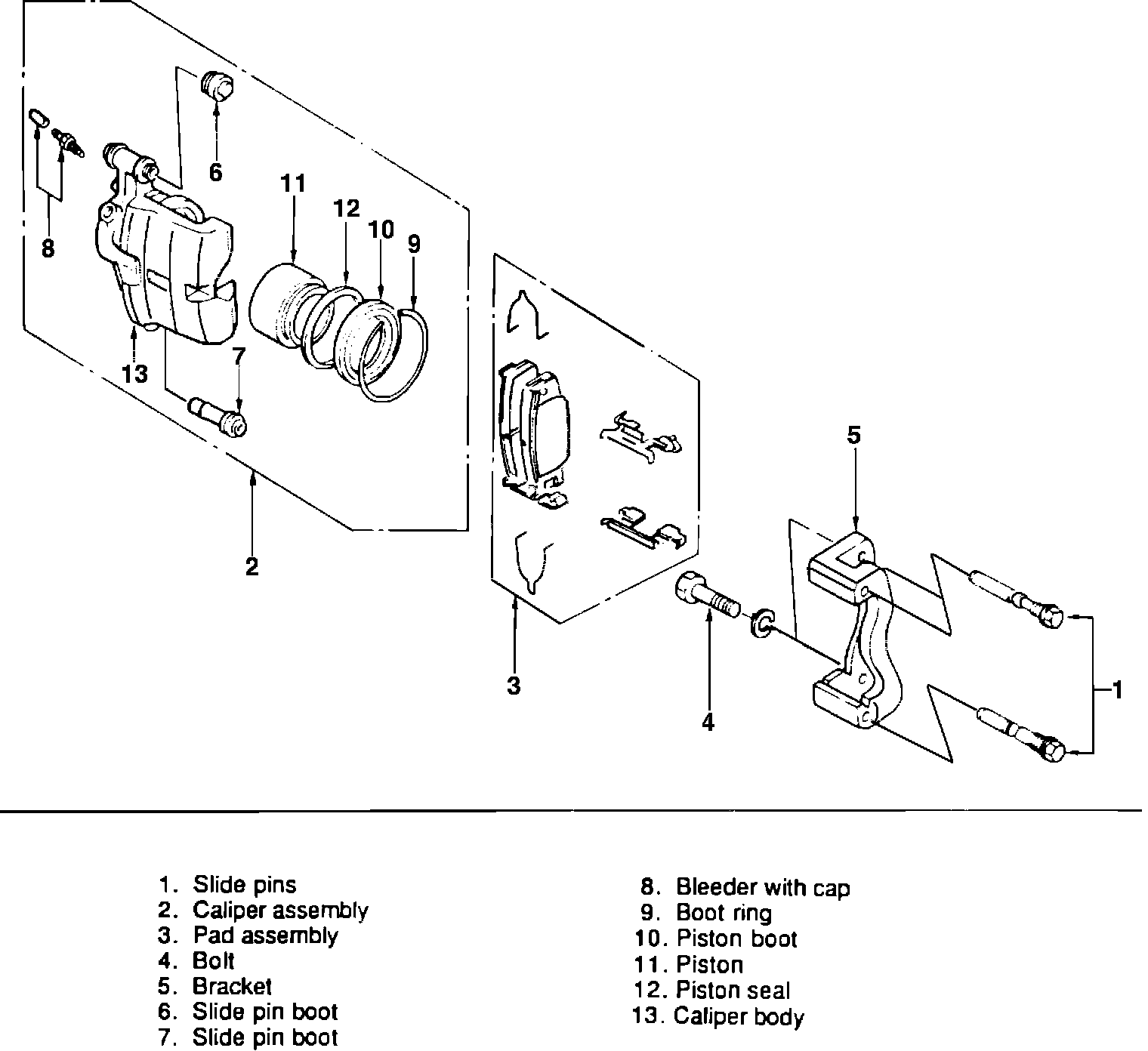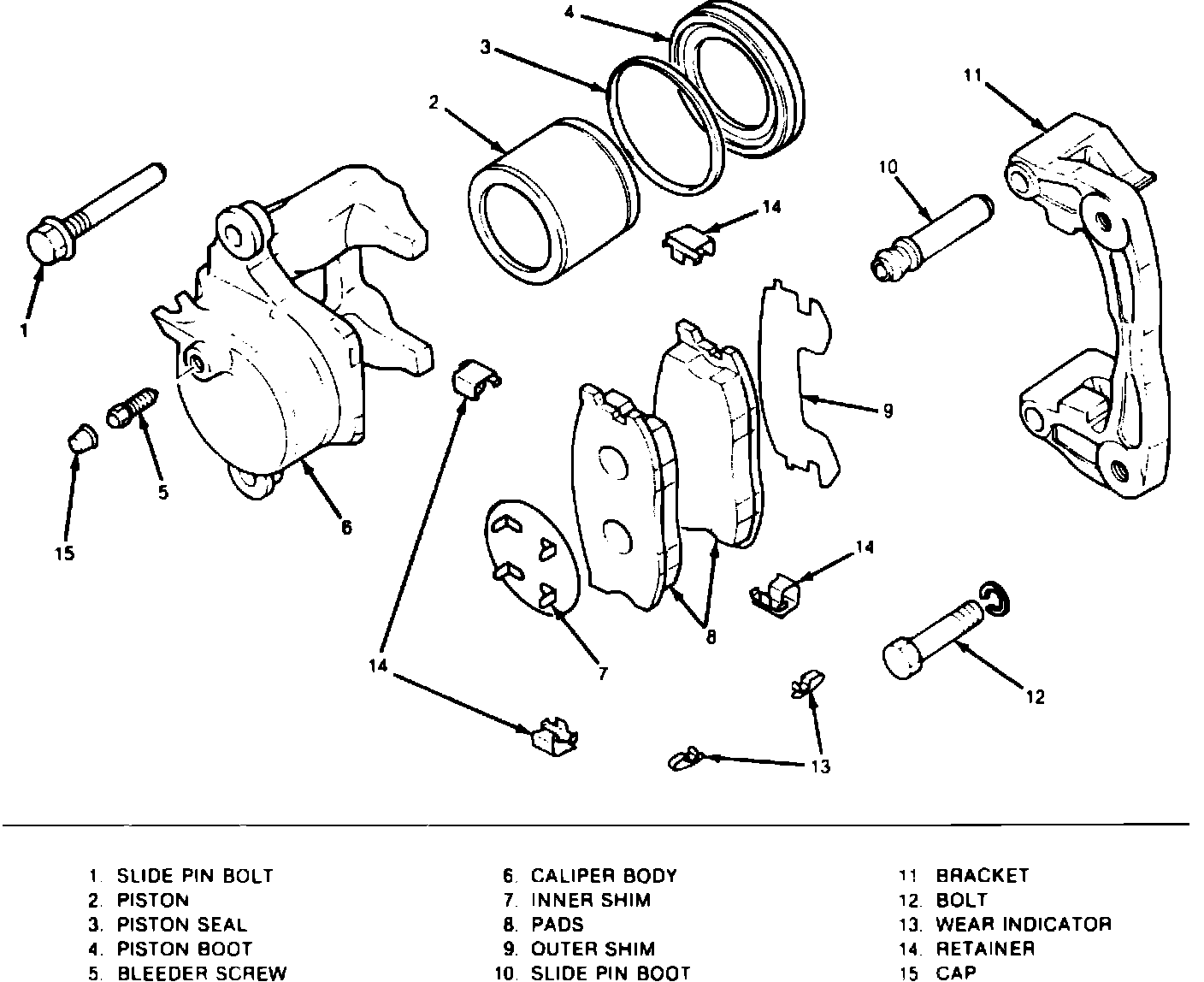 Fig. 1 Exploded view of disc brake caliper assembly. Exc. 1987-88 turbocharged models: