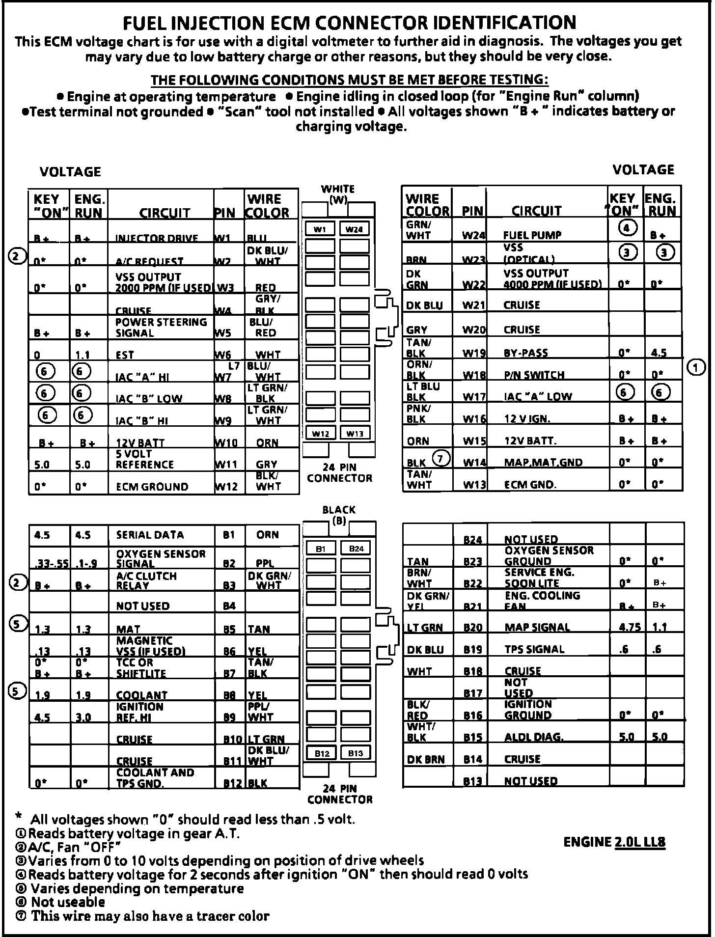 Fig. 011 ECM Connector Terminal I.D. & Volt. Specifications (2 of 2):