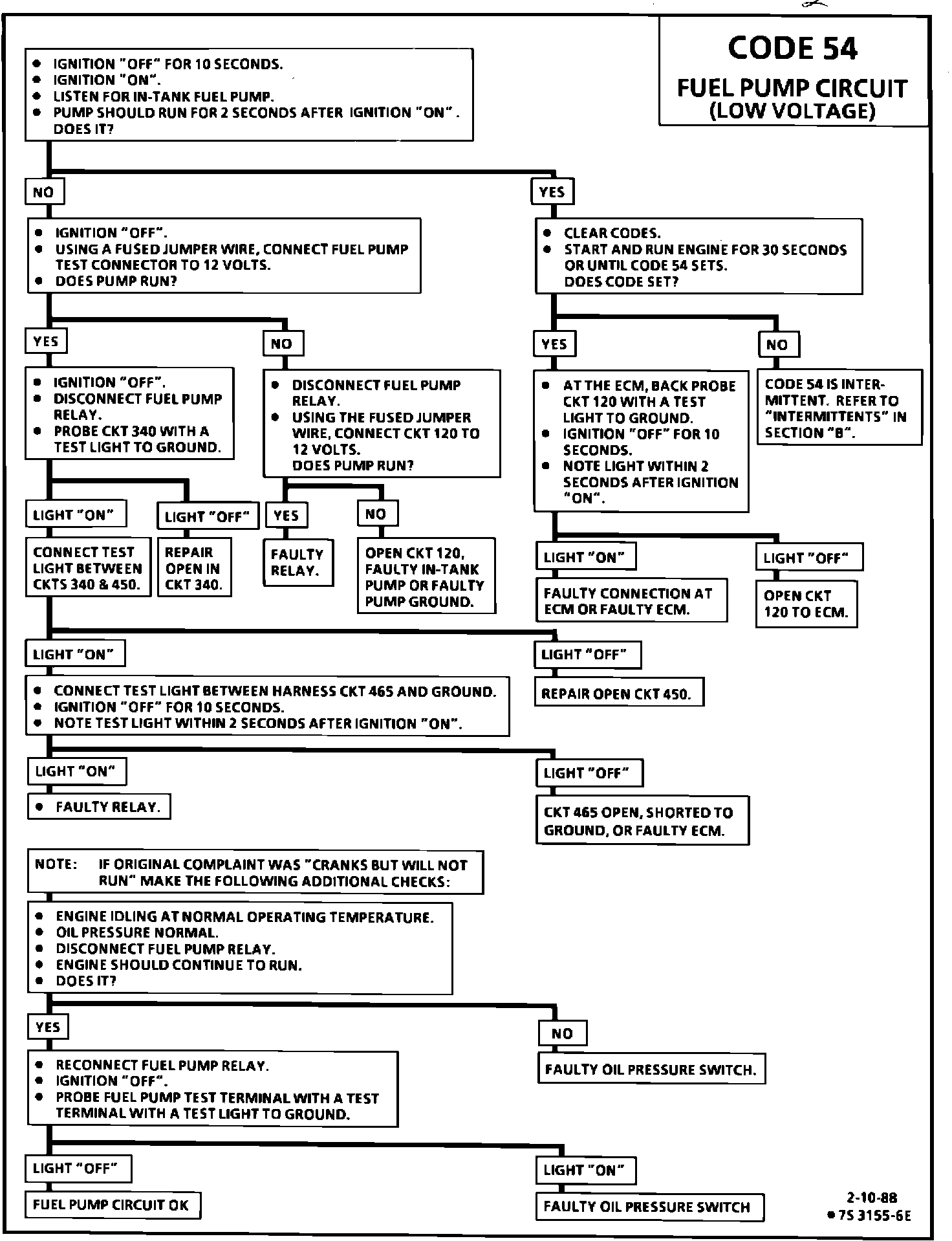 The revised Code 54 diagnostic chart is presented to accurately diagnose the Fuel Pump Circuit. This chart replaces the code 54 charts found in the 1988 final service manual for the previously mentioned engine applications.