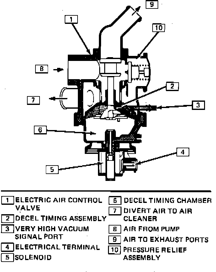 This system is used on models that do not require air injection into the catalytic converter, and is controlled by an Electronic Control Module (ECM). When engine is operating in ``Open Loop'' mode, the valve is energized and air pump output is directed to the exhaust ports. However, a sudden rise in manifold vacuum will close the valve, momentarily diverting air to the air cleaner. When engine is operating in ``Closed Loop'' mode, the valve is not energized and the vacuum signal is blocked. Air pump pressure closes the valve and air is diverted to the air cleaner.