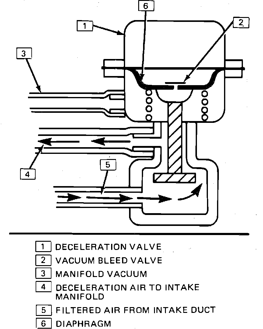 4. If air flow does not continue for at least 1 second or the idle rpm does not drop considerably, check vacuum hoses going to deceleration valve for restrictions or leakage.