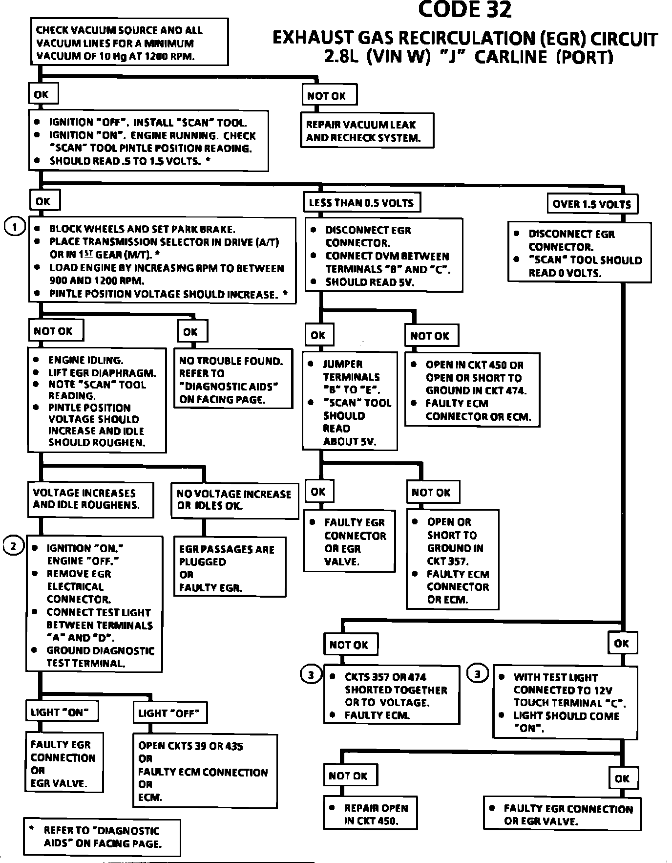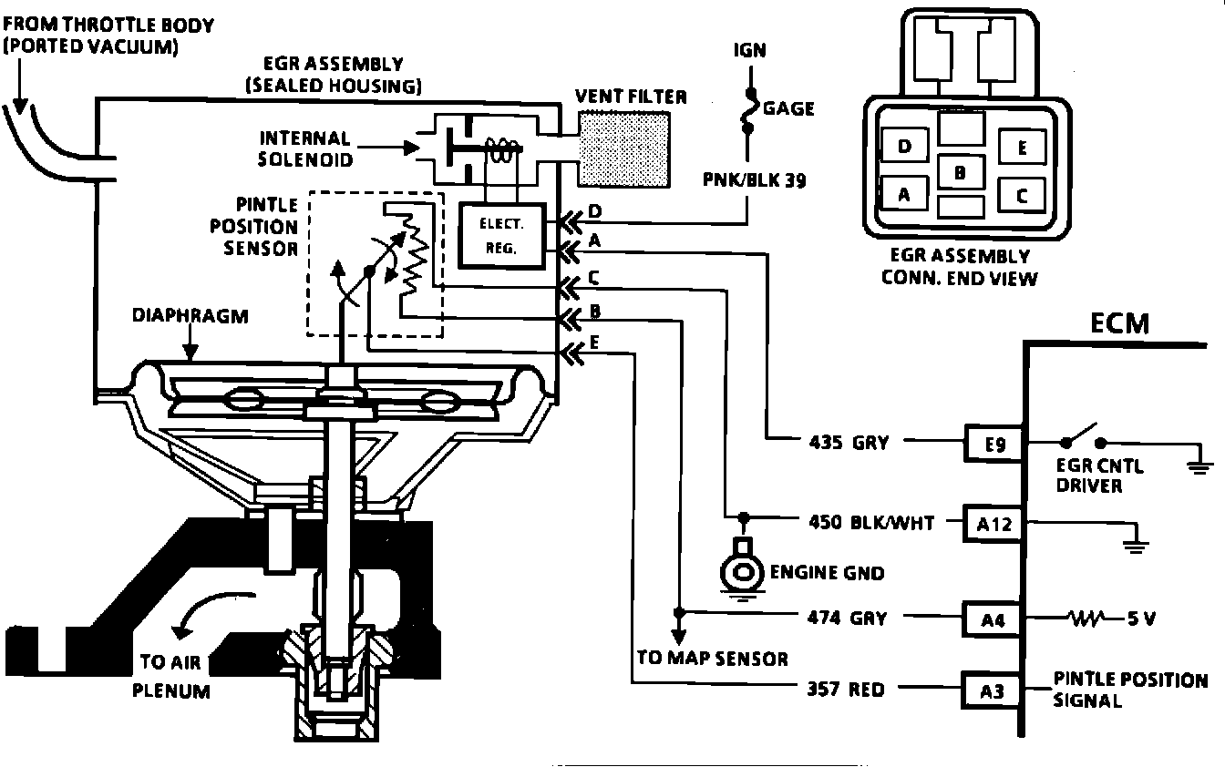 Circuit Description: 2.8L (VIN W) "J" CARLIN E (PORT) The integrated electronic EGR valve functions similar to a port EGR valve with a remote vacuum regulator. The internal solenoid is normally open, which causes the vacuum signal to be vented "OFF" to the atmosphere when EGR is not being commanded by the ECM. This, EGR valve has a sealed cap and the solenoid valve opens and closes the vacuum signal which controls the amount of vacuum vented to atmosphere, and this controls the amount of vacuum applied to the diaphragm. The electronic EGR valve contains a voltage regulator which converts the ECM signal to provide different amounts of EGR flow by regulating the current to the solenoid. The ECM controls EGR with a pulse width modulated signal (turns "ON" and "OFF" many times a second) based on air flow, TPS, and rpm. This system also contains a pintle position sensor which works similar to a TPS sensor, and as EGR flow is increased, the sensor output also increases. Code 32 means that there has been an EGR system fault detected. Code 32 will set under two conditions: