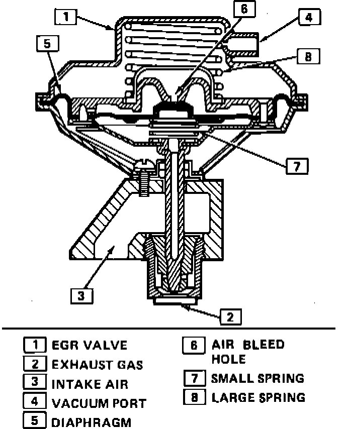 The valve used on this system is a negative backpressure valve. It varies the amount of exhaust gas flow into the manifold depending on the manifold vacuum and variations in exhaust backpressure. The diaphragm on this valve has an internal vacuum bleed hole which is held closed by a small spring when there is no exhaust backpressure. Engine vacuum opens the EGR valve against the pressure of a large spring. When the manifold vacuum combines with negative exhaust backpressure, the vacuum bleed hole opens and the EGR valve closes. The valve will open if vacuum is applied with the engine not running.