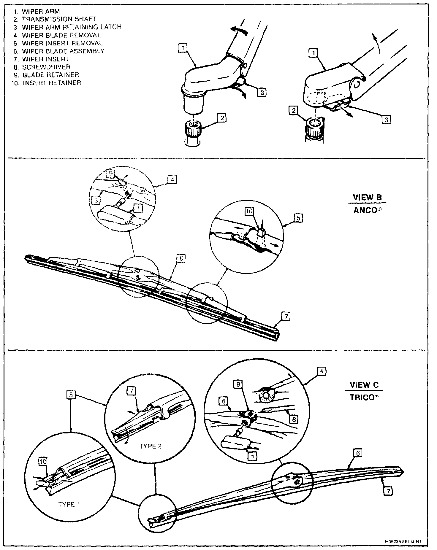 1. With wipers "On", turn ignition "Off" when wiper arm is at the mid-wipe position.