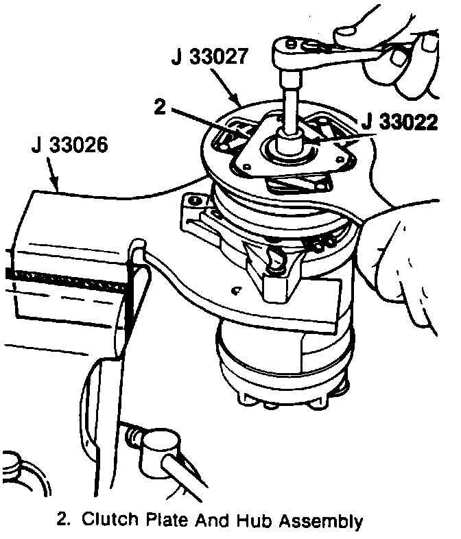 ^ Use J 33027 to hold the clutch plate and hub assembly (2).